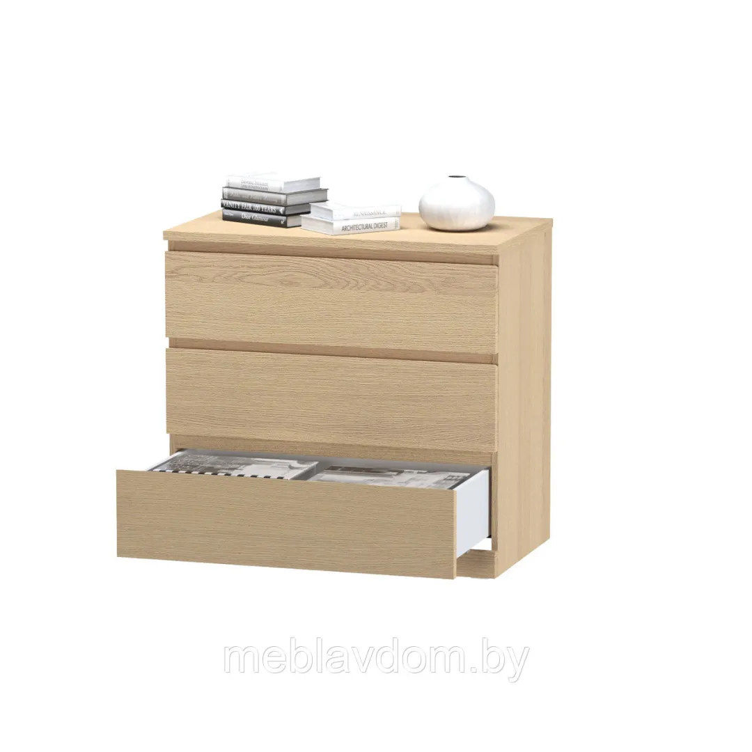 Поверхность комода шпонирована, что делает его доступным по цене, но стильным и современным, с элементами скандинавского дизайна.